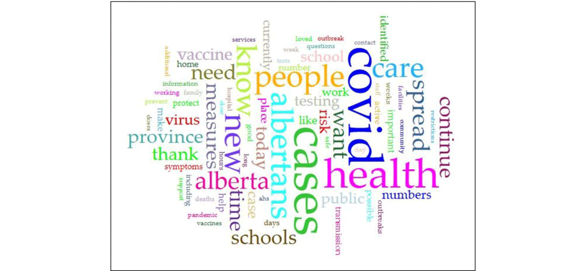 Beginning in March 2020, Alberta’s then-Premier Jason Kenney and Chief Medical Officer of Health (CMOH) Dr. Deena Hinshaw regularly held news briefings about the state of the COVID-19 pandemic in Alberta. These briefings included numbers (deaths, infections, hospitalizations, etc.), research findings about the virus, treatments, possible impacts to the public, the steps the government was taking in response to the virus, public health recommendations, etc. The briefings were livestreamed, and recordings were made publicly available online almost immediately. We gathered the transcripts of these speeches, as they not only represent the government’s official communications on the pandemic, but also provide a record of key announcements and policy changes, including changing numbers of infections and lockdown as they were first officially communicated to Albertans. This provided us with data that can be analyzed for questions such as how the discourse of the Albertan leadership changed over time and juxtaposed with the discourse of the other sources.