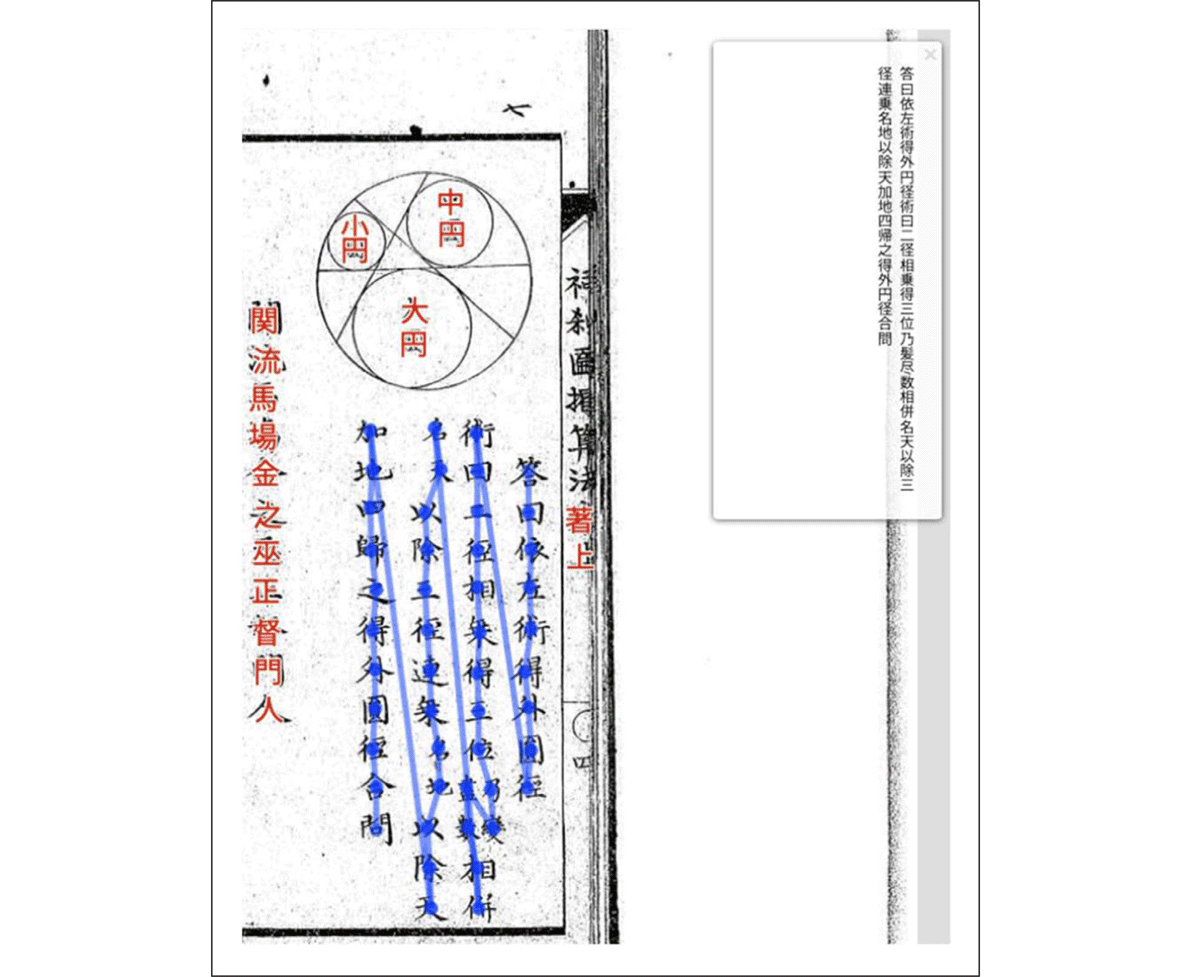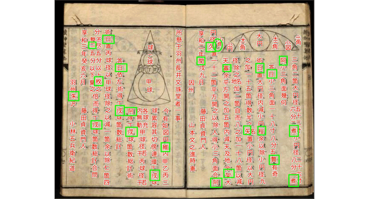 We initially selected 12 koma (コマ, page images of a text—in most cases, images of a double-page spread) from 11 different texts. These were chosen for the diversity of their typeface, layout, and inclusion and exclusion of diacritics and glosses. Six texts were related to the topic of wasan, whilst the other six texts included a broad range of topics such as geography, health, religion, and travel. Two koma were selected from the same publication, Sangaku kōchi 算學鉤致 (1819), albeit from sections using significantly different typefaces. Since KuroNet can only process images published in IIIF format, the choice was somewhat moderated though not significantly hampered by the question of what was readily available. After reviewing the results, we analyzed additional koma from six of the texts.