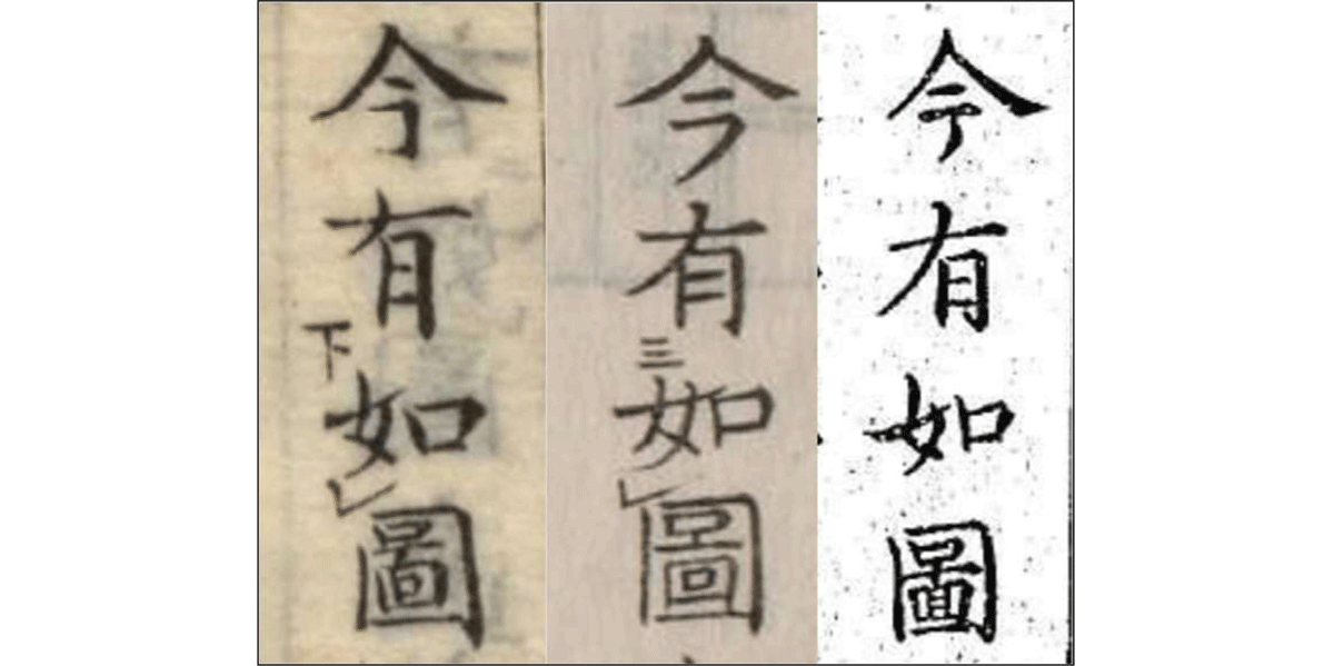 These additional results further corroborate that KuroNet can be used to transcribe works like Zoku shinpeki sanpō, Sanpō kishō, and Shinpeki sanpō with relatively high accuracy. In fact, according to our aforenoted criteria, all of these texts may prove useful for text-mining projects. Taking all transcriptions from the first and second trials into account, we see a total character error rate of 6.36% (199 errors) for Zoku shinpeki sanpō; 4.29% (60) for Sanpō kishō; 7.73% (119) for Shinpeki sanpō; 10.9% (49) for Byōka yōron 病家要論 (1695); 11.85% (52) for Shusetsu yōjō ron 酒説養生論 (1729); and 13.67% (271) for Nantōshi; or a 9.77% (750) CER for all these texts. It is interesting to note that the highest performing texts are all related to mathematics, whilst those on other topics did not perform as well. It seems likely that the accuracy of the transcriptions for Zoku shinpeki sanpō, Sanpō kishō, and Shinpeki sanpō is related to their typefaces and layout, but possibly also a limited and formulaic set of characters. Although the typefaces for each text are different, they are clearly written often in well-spaced, printed (i.e., non-cursive) characters. This can be seen in the following renderings (Figure 3) of the phrase 今有如図, found in the 3 texts from right to left (Zoku shinpeki sanpō, Shinpeki sanpō, Sanpō kishō). In the case of other texts, such as Nantōshi, lower accuracy rates might be related to the prevalence of variant characters (itaiji 異体字), which may not feature in KuroNet’s dataset, amongst other factors.
