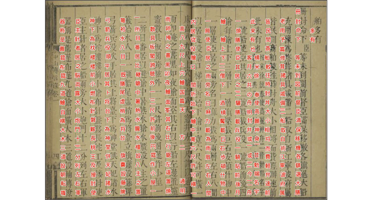 Conversely, in some cases, characters are mistranscribed because they are not included in the dataset. In Chūzan denshinroku, the character 艙, which features 10 times, is not amongst the dataset and hence consistently mistranscribed. This also puts the error rate for this sample in perspective: 10.53% of all erroneous transcriptions are made up of one single character excluded from the dataset. In this particular sample, the text in double columns was well detected, but not always successfully classified. Of 33 characters across two double-column sections, 2 were omitted (臣, which is in the dataset, and 兢, which is not). In addition, 9 characters were erroneous (按 to 横, 宋 to 米, 舟 to 身, 二 to 一, 皆 to 昔, 字 to 宇, 舟 to 月, 八to の, 弁 to 舟), although each of these feature in the dataset. Finally, 1 extra character was added where the character 二 was transcribed twice as both 二 and 一 and thus overlapping in the output image. The same error features an additional 3 times elsewhere in this text. One factor contributing to the issues above may have been the lower quality of the scan available for this text (see Figure 5).