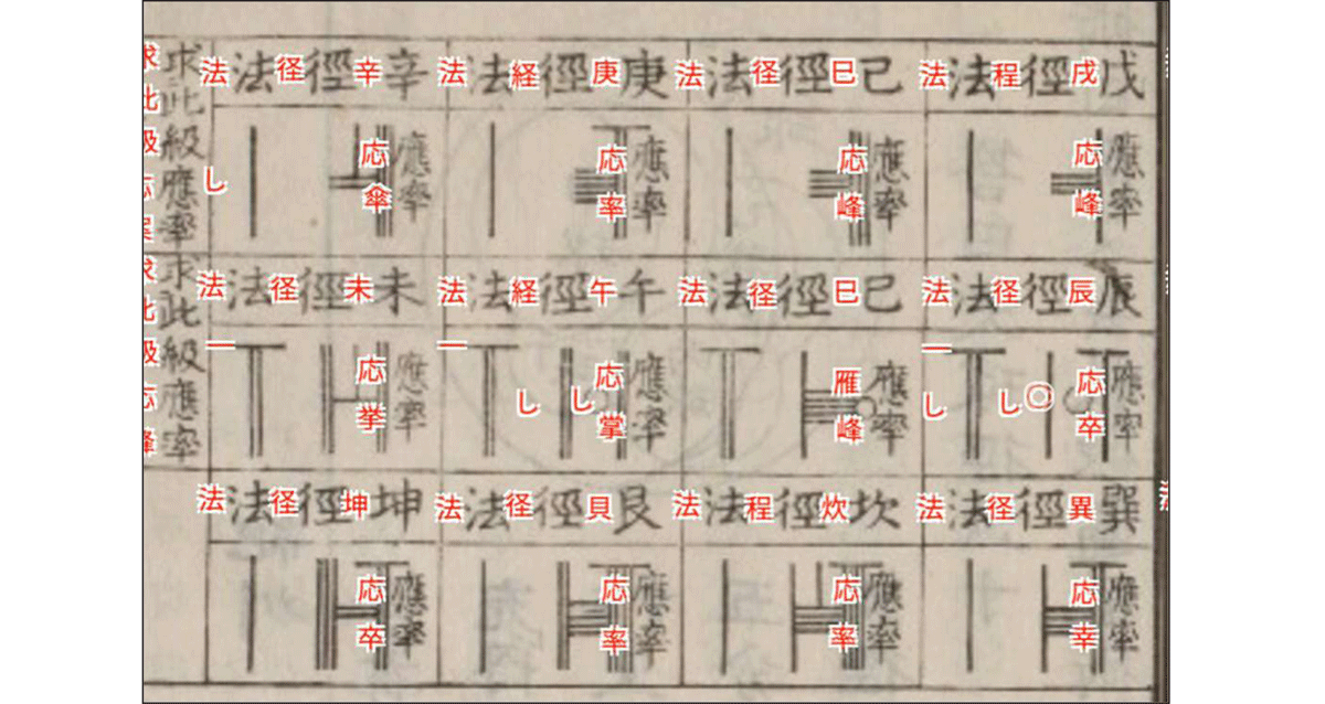 Characters within illustrations were not included in the analysis since KuroNet is specifically trained to omit them (Clanuwat, Lamb, and Kitamoto 2019). Still, some of them were identified by KuroNet in the test pages regardless and also transcribed correctly on occasion. In Sanpō kishō, 13 of 26 characters included in the figure were missing. In Zoku shinpeki sanpō, 12 of 18 characters were missing in one of the figures, whilst 6 of 8 characters were missing for the second figure with only one mistranscription. Finally, whilst all the characters in the figure in Shinpeki sanpō were transcribed, there was a CER of 24.52% (38), as well as an extra 9 characters featuring in the output. The koma from the Shinpeki sanpo featuring images of sangi (calculation rods typically depicted as vertical and horizontal lines) had KuroNet interpreting a few of the sangi images as characters, presumably thanks to their regular format (see Figure 8). NDL OCR is trained to transcribe annotations within illustrations. Whether it is beneficial to include these characters within a final transcript depends on the use case; for example, it would not help to include them in a text-mining corpus or in a transcript used for a text edition. Within the scope of this article, we are therefore not considering the transcription of these annotations in our analysis.