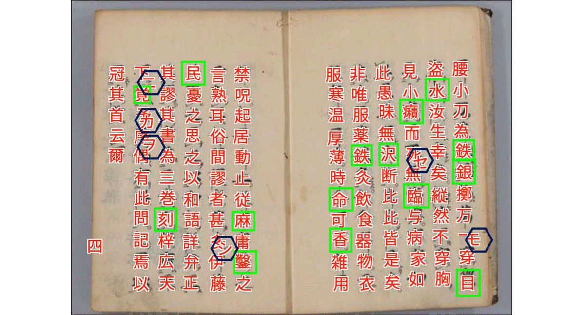 A mix of character forms would be desirable if it reflected the original source, where such a variety may indeed be present; however, in this case, NDL OCR’s output does not always reflect the actual forms in the text. If we were to transcribe the sample sentence (overlooking the mistake in NDL OCR’s transcription) using modern character forms, 實 and 經 would be written as 実 and 経; if we were to adopt an approach using historical forms as they appear in the source, 為 and 国 would be written as 爲 and 國. As to the rest of the characters, the shape would remain the same throughout either transcription. Thus, a transcription consistent with the text itself would read as 無不由之也實爲經疫治國也, and one using modern character forms would be 無不由之也実為経疫治国也. This issue adds to processing time: either all characters have to be checked to ensure they are consistent with the transcription policy, or the entire output has to be changed into modern forms.