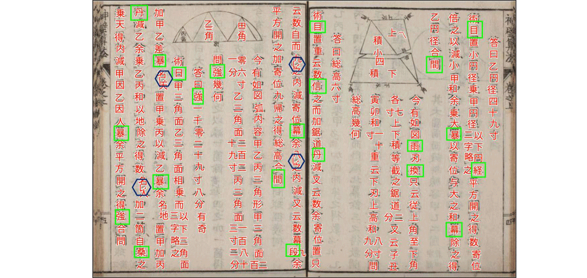 A considerably larger issue, particularly with regard to the mathematical texts in our sample, relates to layout analysis, and word and sentence order. Because NDL OCR uses line segmentation, it sometimes produces ordering errors. This is particularly noticeable with warigaki (double columns within lines) especially when there are multiple sections of warigaki in a single line or the warigaki crosses into a new line. For instance in Shinpeki sanpō (see Figure 2), a human eye would read the first number written in warigaki as 259 (二百五十九) split across two lines. NDL gives us 2 (二), a character error M, 50 (五十), a short line of text, part of the next double column—number 501 (五百一)—and then returns to the original double column to give the left-hand side—the number 9 (九)—before continuing with the sentence. In other words, whereas we would like to see the number 259, we actually receive an output of four numbers: 2, 50, 501, and 9. A similar ordering issue is seen with the next part of warigaki within the same sentence. Table 2 is intended to make this easier to visualize. The table shows the expected output (the output in the correct order) and NDL OCR’s output. The output is split into portions (lines) as identified by NDL OCR; in reality, this is a single line of text with two characters from the preceding line included at the beginning. We have removed diacritics and highlighted the output corresponding to the first part of warigaki in red and the output corresponding to the second section of warigaki in blue.