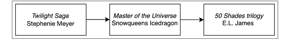 There are two moments of transformation in this case study, visualized in Figure 1 as the two arrows: the adaptation from the Twilight Saga into the fanfiction Master of the Universe, and the adaptation of that fanfiction into the Fifty Shades trilogy. Note that we use Fifty Shades to refer to the trilogy as a whole, and Fifty Shades of Grey to refer to the trilogy’s first novel. Likewise, we use Twilight Saga to refer to the entire series, and Twilight to reference its first novel. The changes made from Master of the Universe to the published Fifty Shades books are minimal: character names were changed to avoid copyright infringement, and the two-part fanfiction was turned into a three-part book series. These changes seem primarily practically and financially motivated.