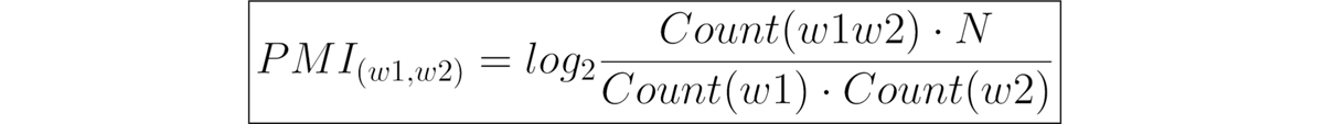 PMI is the ratio of the probability of seeing a bigram (a pair of words) versus the probability of independently seeing the two words that make up the bigram (Figure 3). In other words, PMI expresses the probability of a collocation occurring given the occurrence of the individual words (Bouma 2009). Thus, PMI is a way to measure collocational patterns while taking into account that the co-occurrence of words is strongly impacted by the frequency or occurrence of individual words.