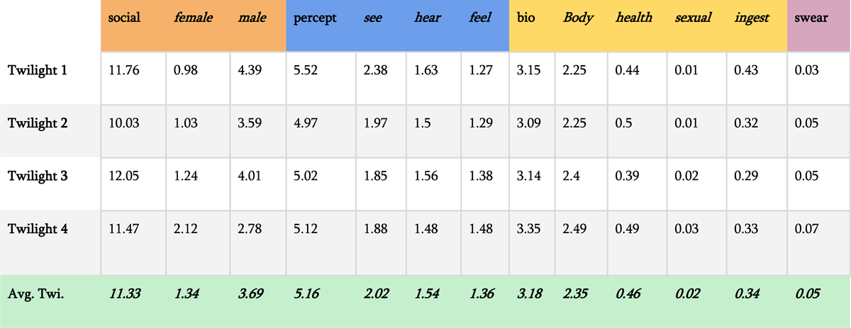 Table 3 and Table 4 present LIWC results for the full texts of each book series. Table 5 presents a LIWC analysis of the PMI results of the focus words for the first book in each series. Some LIWC categories stand in a hierarchical relation to each other: “female” and “male” are both subcategories of “social”; “see,” “hear,” and “feel” are the three subcategories that make up “perception”; and “body,” “health,” “sexual,” and “ingest” (short for “ingestion”) together make up the “bio” category. We have visualized this in the tables by italicizing subcategories and giving each category its own colour.