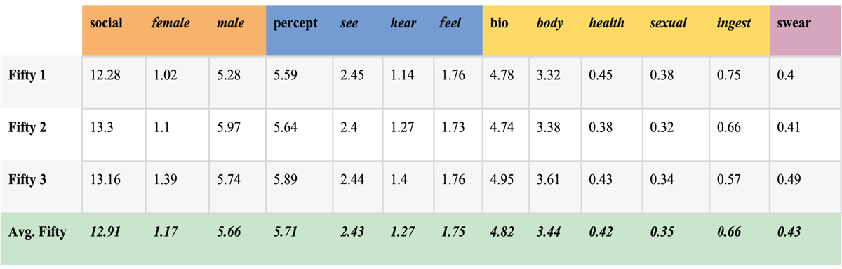 Finally, we used Linguistic Inquiry and Word Count or LIWC (Pennebaker et al. 2015) to calculate the percentage of words related to a specific domain of meaning in our corpora as defined by LIWC’s dictionaries. LIWC is a tool for analyzing word use that consists of two parts. The first is a set of dictionaries through which categories of meaning are defined. The second is an interface that allows users to upload texts, then counts every occurrence of a word from one of the dictionaries and expresses these counts in percentages. For example, the word “sister” occurs, among others, in the LIWC categories social, family, and female. Therefore, the sentence “I love my sister” would score 25% in these categories, since 25% (or one-quarter) of words in the sentence fall into that category.