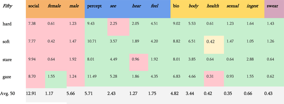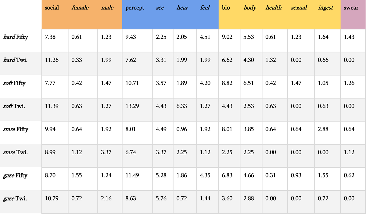 Both series of books, when analyzed as a whole using LIWC, contained a high percentage of words relating to the male gender (3.69% on average for the Twilight Saga and 5.66% for Fifty Shades, with only a little over 1% female-related words in both series). Intuitively, this makes sense because both are first-person narratives by female narrators preoccupied with their male objects of affection. However, in both texts, male-related words were much less frequent in the PMI results relating to focus words than in the texts as a whole, fluctuating between 1.23% and 3.37%. In Fifty Shades this difference was more pronounced, with none of the PMI results containing more than 2% male-related terms. In other words, while male-related words are more prevalent in both texts compared to female-related words, this difference becomes much smaller in the PMI results, (i.e., in words likely to co-occur with the words “hard,” “soft,” “gaze,” and “stare”). The words surrounding our selected terms are not marked by a difference in gender-related words.