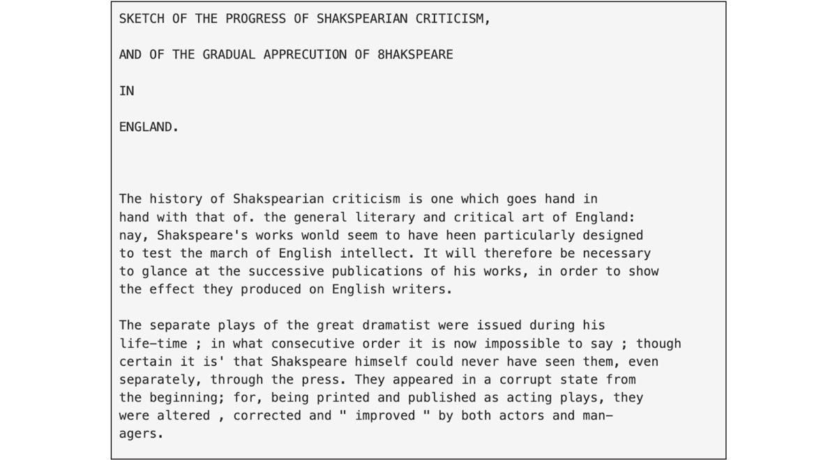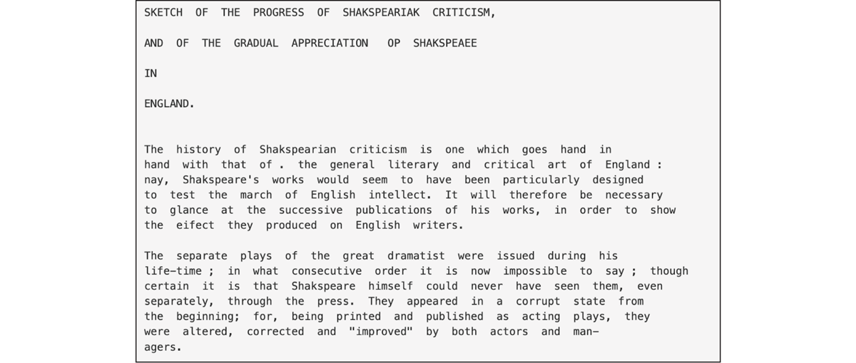 These are examples of optical character recognition outputs from the Internet Archive page image “Sketch of the Progress of Shakspearian Criticism” (p. 1) of Text C of Thimm’s bibliography.