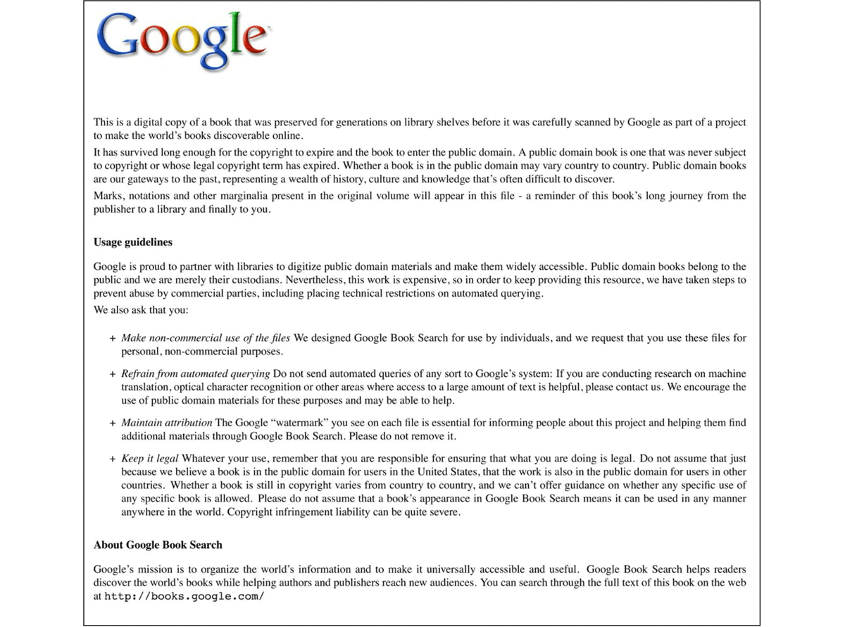 When we turn to Thimm’s introduction, however, we see markedly fewer errors in the OCR’d transcription (see Figure 9, Figure 10, and Figure 11, all digitized versions of the 1872 edition). When it comes to the introduction, Text C is the least faithful to the page. (For more on how OCR is undertaken at the Internet Archive, see Wajer [2020] 2023.) Both the C and E texts include an added prefatory page from Google in the file and in the transcription, which will be familiar to scholars (see Figure 12; the OCR of this boilerplate also differs between both texts, with more errors in C). Text E also includes a digital watermark on each page that reads “digitized by Google.” The OCR transcription includes this watermark; this means that the word “Google” appears 134 times in this digital text, and not at all in the physical one. The added material from Google (the prefatory page and digital watermark) does not exclude this digital text from possible text analysis, but rather reminds us of the importance of understanding, and perhaps cleaning, our text before we undertake text analysis. (These could, for instance, be easily removed from the digital text before text analysis, though it would be important to document these changes).