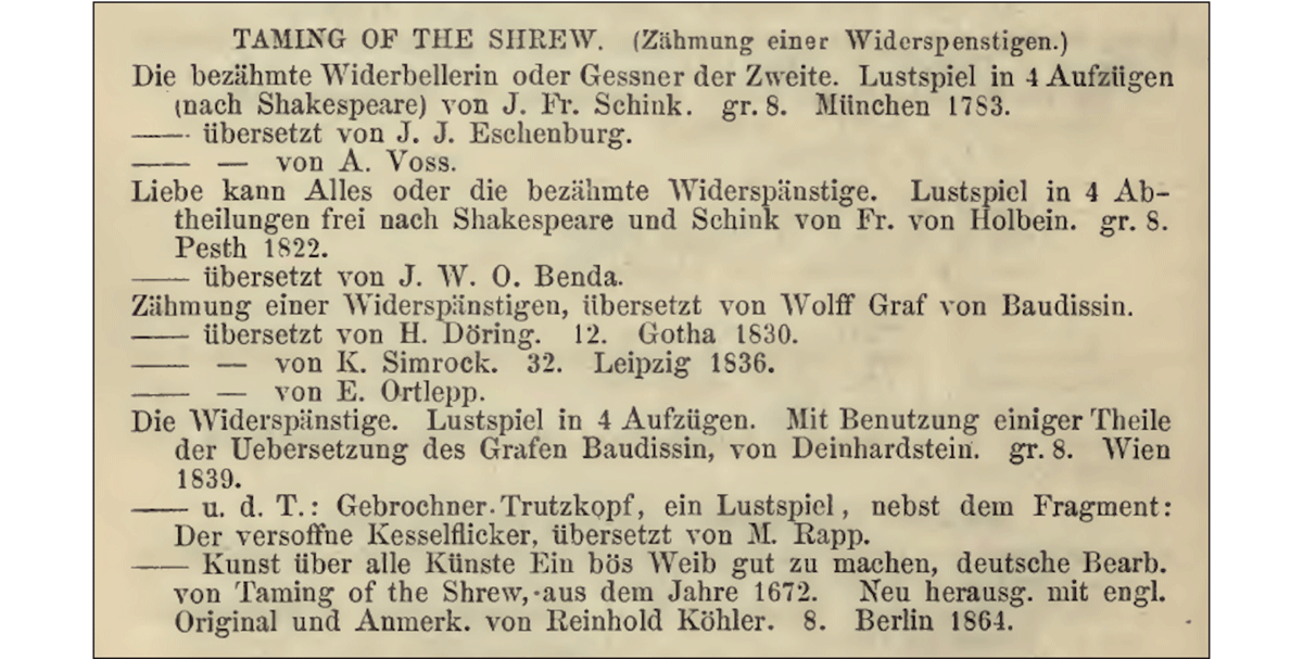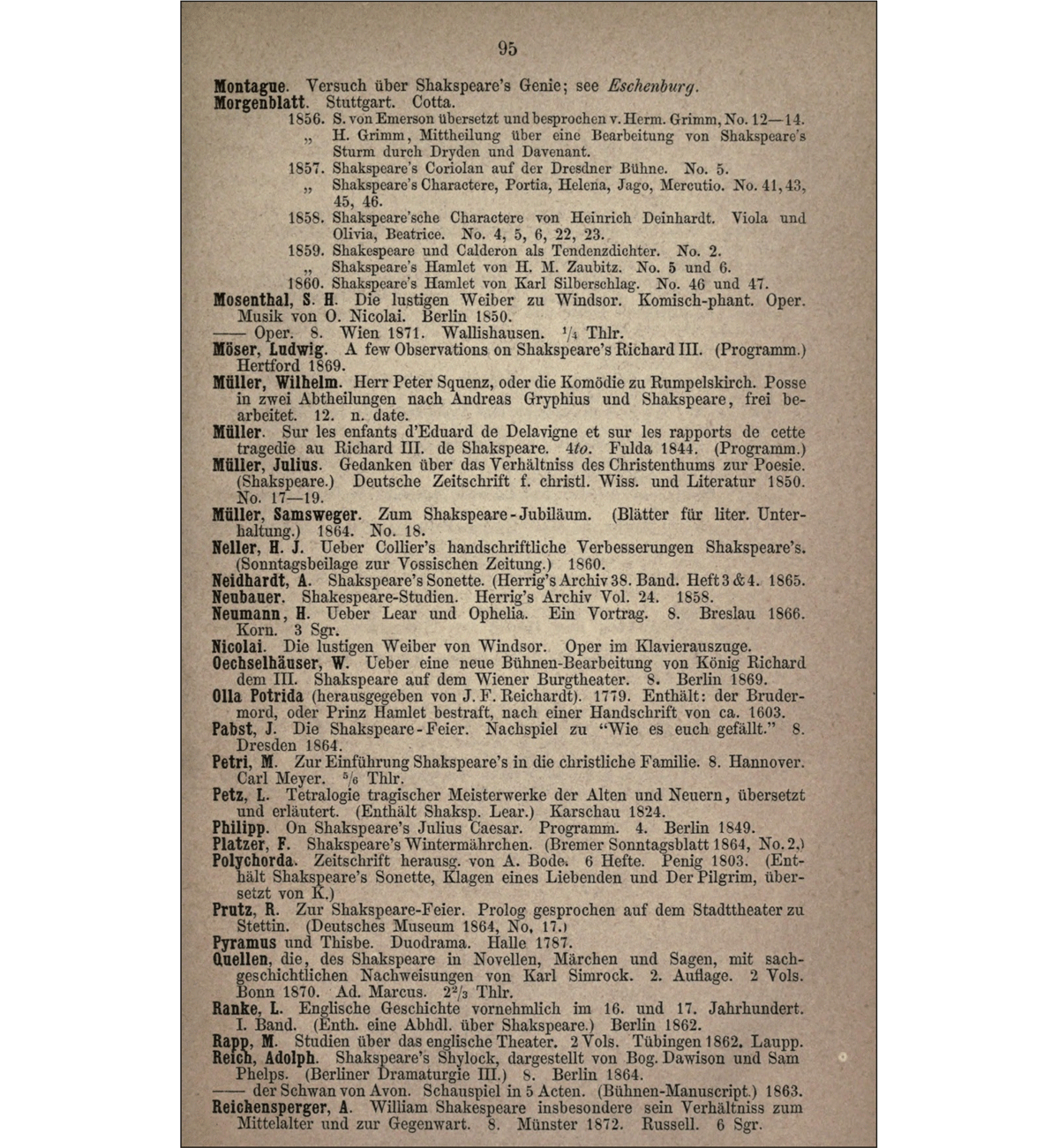 Thimm’s Shakspeariana from 1564–1864 (1872), p. 95, from the section on “German Shakspeariana.” Digitized by the Internet Archive, https://archive.org/details/shakspearianafro00thimrich.