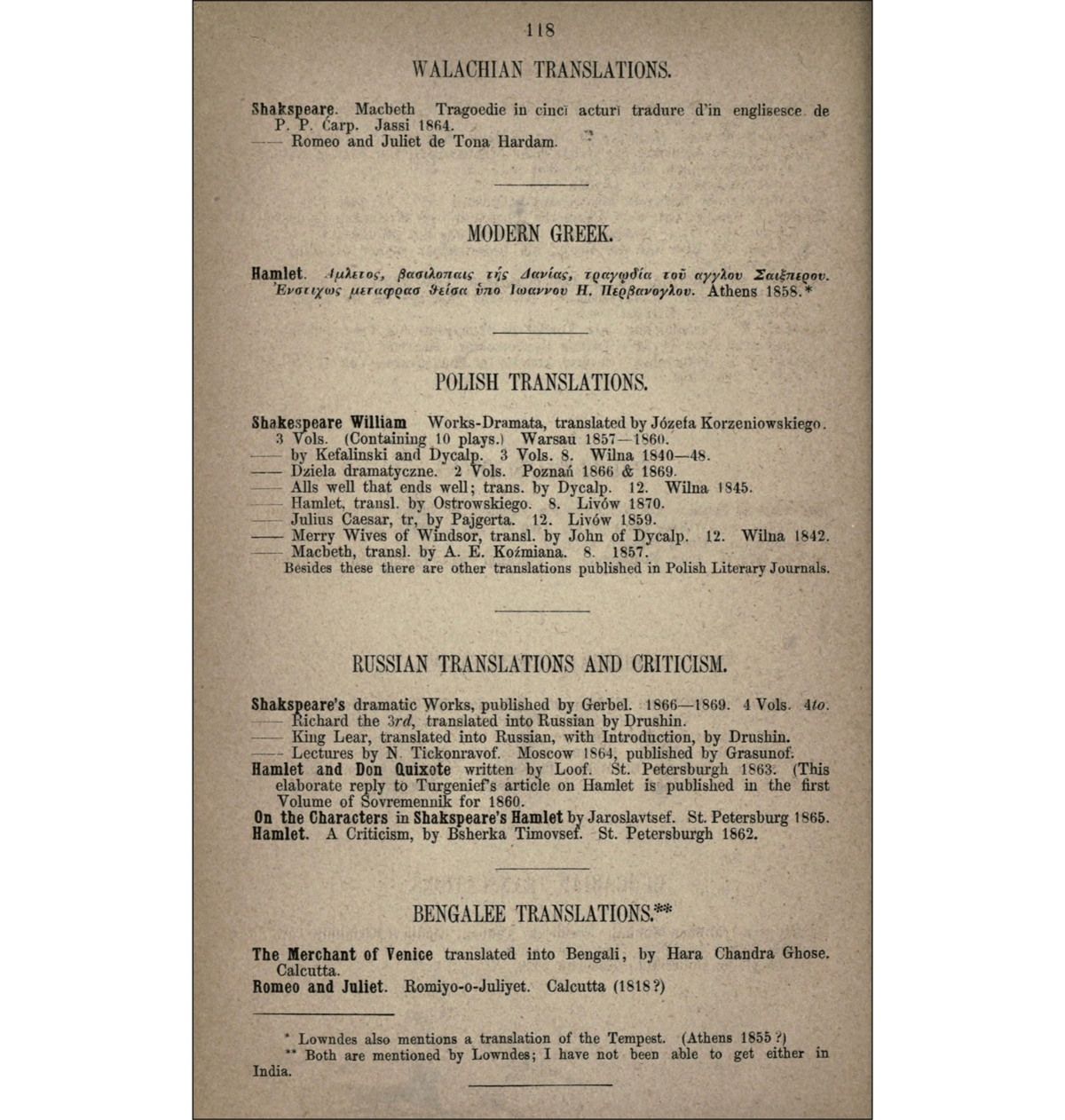 Nineteenth-century Shakespeare scholarship was published in many countries across Europe and North America. The bibliographies that attempted to catalogue this scholarship, as well as translations and editions of Shakespeare’s plays, were similarly published in multiple countries. In England, for instance, John Wilson’s Shaksperiana (London, 1827), James Orchard Halliwell-Phillipps’s Shakesperiana (London, 1841), and Henry J. Bohn’s The Biography and Bibliography of Shakespeare (London, 1863) are but a few examples of Shakespeare bibliographies (see Craig et al. 2026, for more examples; for additional examples of nineteenth-century bibliographies, with links to those that are available open access, see Estill, forthcoming). Beyond England, Jurriaan Moulin published Omtrekken eener algemeene litteratuur over William Shakespeare en deszelfs werken (Outlines of a General Literature on William Shakespeare and His Works) ([Kampen, the Netherlands], 1845); Max Koch included over sixty pages of bibliography in his tome ШЕКСПИРЪ (Shakespeare) (Moscow, 1888); and Morgan Appleton’s Digest Shakespeareanæ (New York, 1886–1887) was published for the New York Shakespeare Society. Some bibliographers emphasized the contributions to Shakespeare scholarship from their region, such as Karl Knortz’s An American Shakespeare Bibliography (Boston, 1876); Thomas James I. Arnold’s Shakespeare-Bibliography in the Netherlands | Shakespeare in de Nederlandsche letterkunde en op het Nederlandsch tooneel. Bibliographisch overzicht (The Hague, 1879); and Ludwig Unflad’s Die Shakespeare-literatur in Deutschland (Shakespeare Literature in Germany) (Munich, 1880). Shakespeare bibliography was undertaken in multiple countries and multiple languages; many of these bibliographies tried to capture the multilingual scholarship of the day. Thanks to digital archives such as HathiTrust, the Internet Archive, and Google Books, we now have access to facsimiles and full texts of many of these enumerative bibliographies that document publications about Shakespeare.
