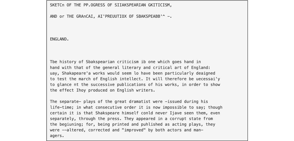 Dirty OCR (as we see in Figure 4, Figure 5, Figure 6, Figure 7, and Figure 8; and Figure 9, Figure 10, and Figure 11) has downstream effects on scholarly research. David A. Smith and Ryan Cordell point out that “researchers and students alike rely on search in OCR collections, often unwittingly” (Smith and Cordell 2018, 8). When we search large corpora such as the Internet Archive, or, indeed, the results that we find from any internet search, we find texts that have been automatically recognized. Cordell summed it up: “most humanities scholars … rely on the output of OCR algorithms. In other words, OCR is a fundamental element of our digital research infrastructure that’s also easily overlooked because we tend to focus on the images of historical pages rather than the underlying text data that helped us find them” (Cordell 2019). Because researchers are often unaware of the quality of the OCR they are searching or using to draw quantitative information from, Ian Milligan suggests that “there is a good chance that we are now ascribing to ourselves greater authority than is warranted” (Milligan 2013, 564). Milligan calls for “a critical methodology” when it comes to using scholarly databases and corpora of historical texts. In short: we must be critical about the texts we use and the claims we make as we undertake our scholarly searches.